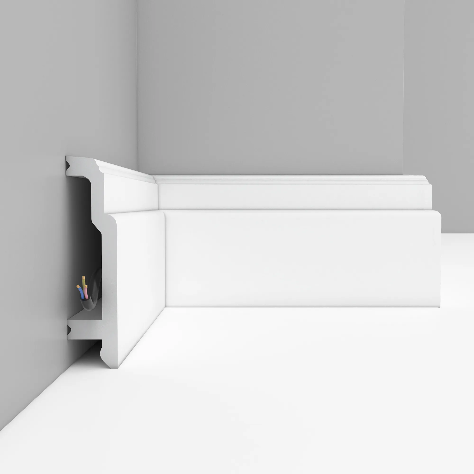 Напольный плинтус A155 Decomaster из дюрополимера он же (экополимер, композит, фитополимер) ударопрочной, легкий в монтаже. Плинтус готов к покраске лакокрасочными материалами не содержащие растворитель. Дюрополимер не содержит токсичных продуктов и со временем не дает усадку. Рекомендуется использовать стыковочный клей для соединительных стыков.