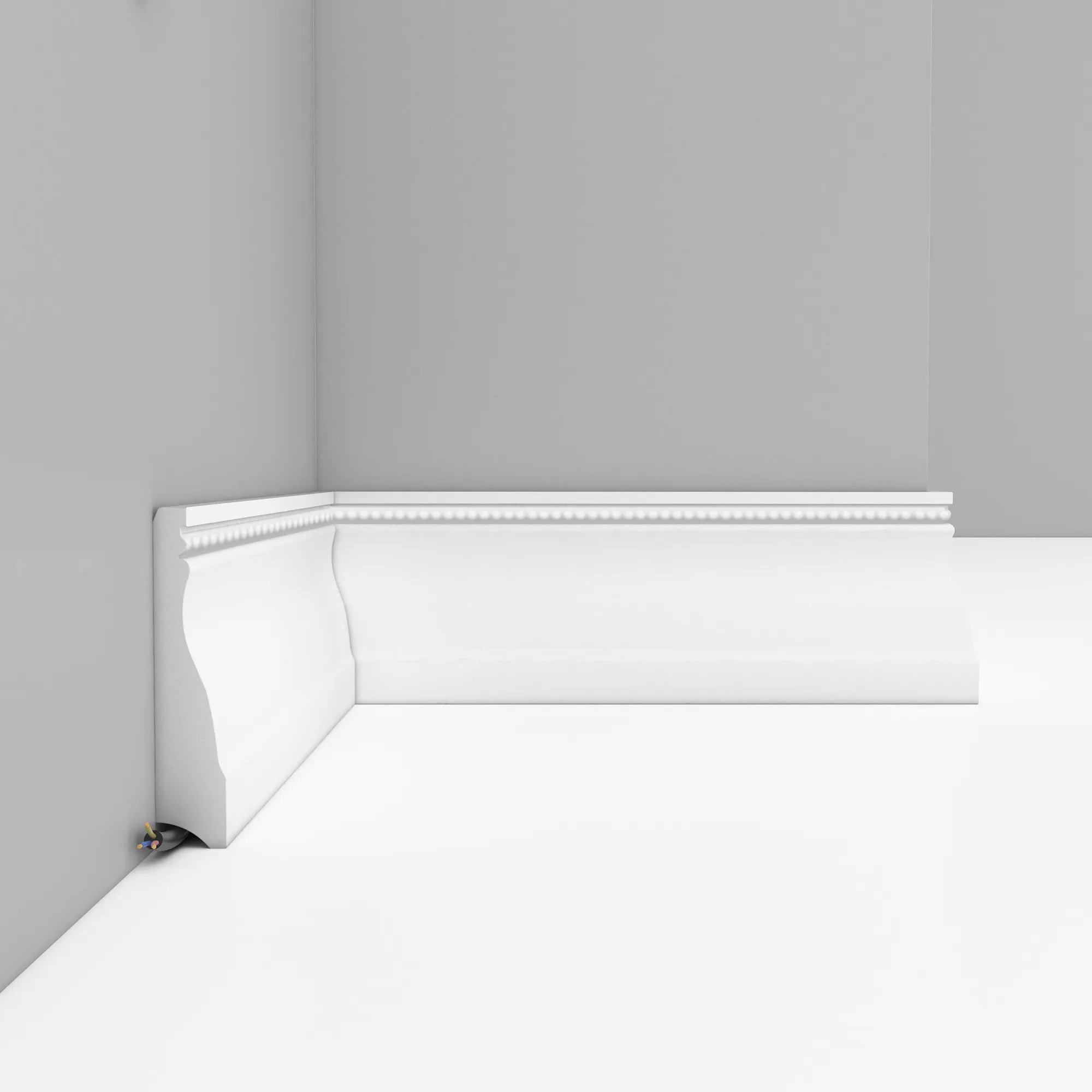 Напольный плинтус D193A Decomaster из дюрополимера он же (экополимер, композит, фитополимер) ударопрочной, легкий в монтаже. Плинтус готов к покраске лакокрасочными материалами не содержащие растворитель. Дюрополимер не содержит токсичных продуктов и со временем не дает усадку. Рекомендуется использовать стыковочный клей для соединительных стыков.