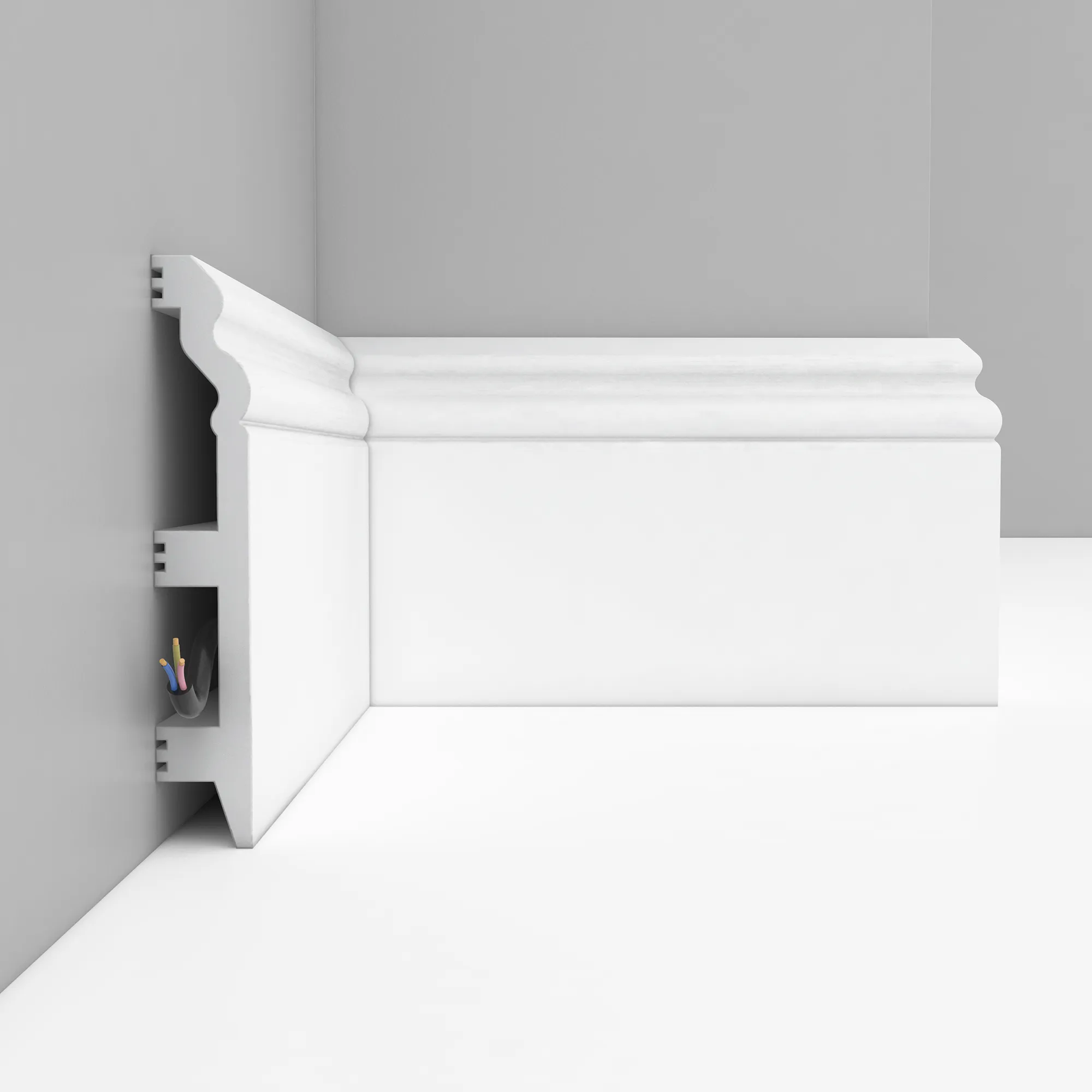 Напольный плинтус D233 Decomaster из дюрополимера он же (экополимер, композит, фитополимер) ударопрочной, легкий в монтаже. Плинтус готов к покраске лакокрасочными материалами не содержащие растворитель. Дюрополимер не содержит токсичных продуктов и со временем не дает усадку. Рекомендуется использовать стыковочный клей для соединительных стыков.