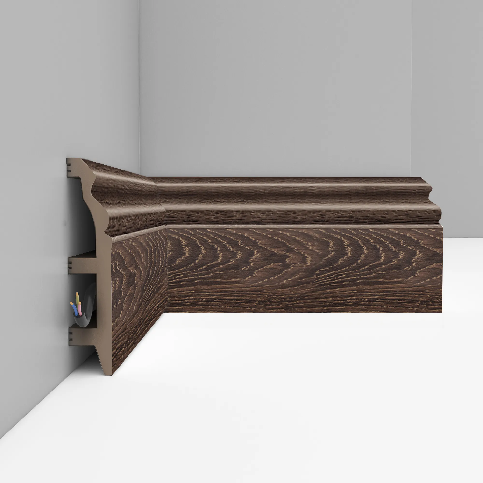 Окрашенный напольный плинтус D232-81 Decomaster из дюрополимера, длина 2,40 м, ударопрочный, влагостойкий. Дюрополимер не содержит токсичных продуктов и со временем не дает усадку.