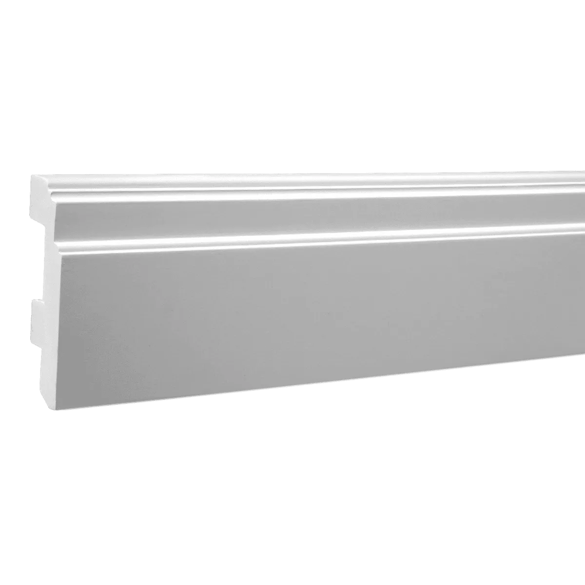 Плинтус 1.53.101 из пенополиуретана отечественного производителя Европласт, можно использовать в сухих помещениях и с повышенной влажностью, т.к. они не боятся воды и перепадов температуры. Наличие двух кабель-каналов позволяет скрыть все провода. Изготавливается в жестком и гибком вариантах. При монтаже изделий стыковочный клей применяется всегда в обязательном порядке, т.к. он обеспечивает 100%-ную надежность стыковки напольных плинтусов друг с другом, затирает швы до полной невидимости. Все изделия Европласт уже загрунтованы под покраску. Рекомендуется пользоваться качественными красками на водной основе без содержания ацетона, лучше всего наносить пульверизатором. Хорошие краски не оставляют разводы на лепнине.