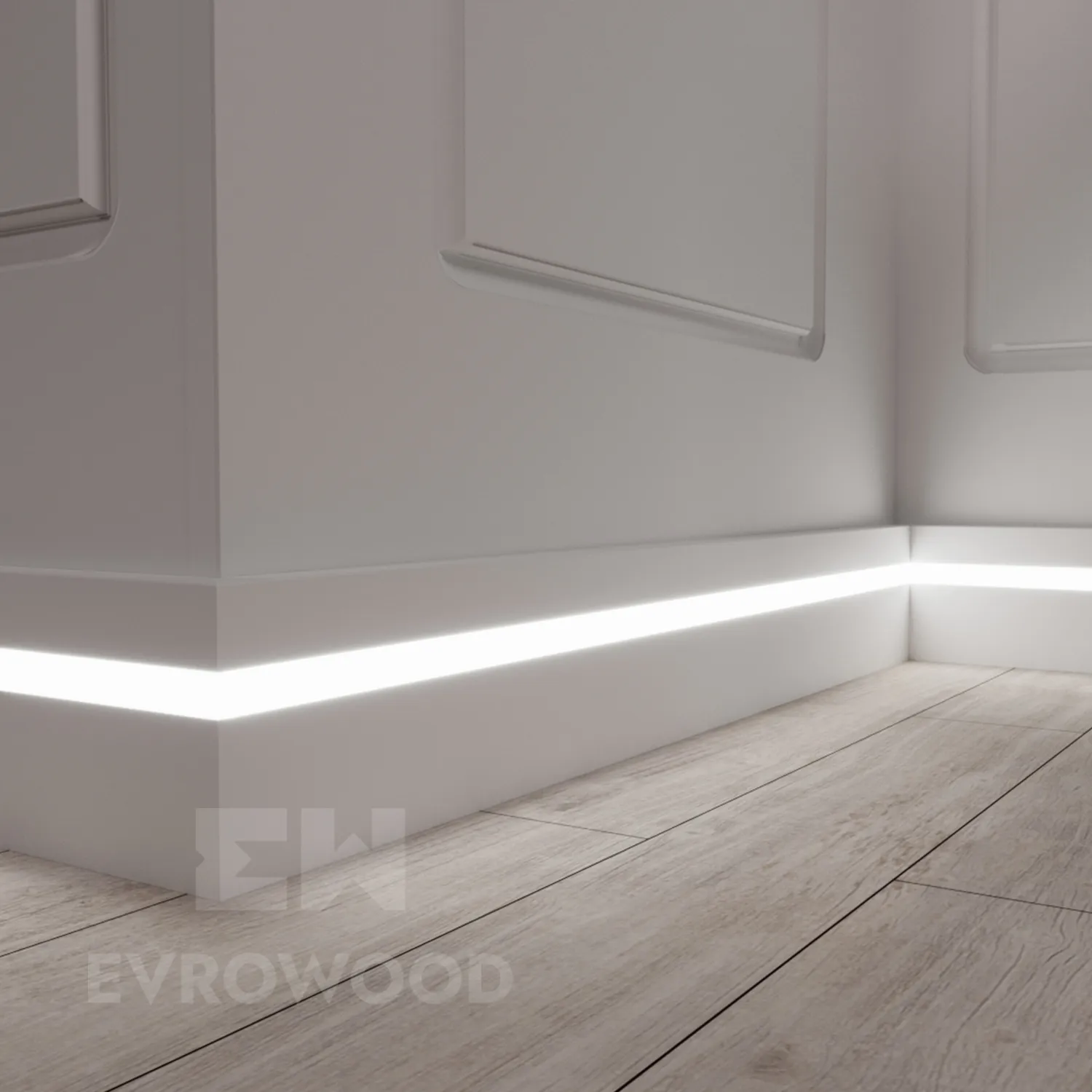 Плинтус напольный МДФ Evrowood PN 101 LED для светодиодной ленты станет идеальным решением для обустройства скрытого освещения в помещениях любого типа.