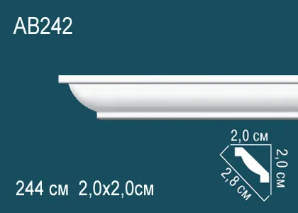 Карниз AB 242 с гладким профилем из полиуретана компании Перфект. Материал высокой прочности, гибкости, водонепроницаемого, стойкого к перепадам температур и воздействию света, что позволяет монтировать не только в сухих, но и влажных помещениях. Для монтажа карнизов рекомендуется использование монтажного и стыковочного клея во избежание расхождения швов. Перед покраской рекомендуем прогрунтовать изделия для лучшего окрашивания лакокрасочными материалами не содержащие растворителей.