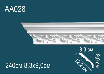 Карниз AA028 с орнаментом из полиуретана компании Перфект. Материал высокой прочности, гибкости, водонепроницаемого, стойкого к перепадам температур и воздействию света, что позволяет монтировать не только в сухих, но и влажных помещениях. Для монтажа карнизов рекомендуется использование монтажного и стыковочного клея во избежание расхождения швов. Перед покраской рекомендуем прогрунтовать изделия для лучшего окрашивания лакокрасочными материалами не содержащие растворителей. Есть гибкий аналог.