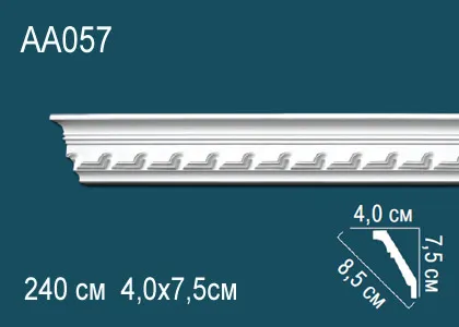 Карниз AA057 с орнаментом из полиуретана компании Перфект. Материал высокой прочности, гибкости, водонепроницаемого, стойкого к перепадам температур и воздействию света, что позволяет монтировать не только в сухих, но и влажных помещениях. Для монтажа карнизов рекомендуется использование монтажного и стыковочного клея во избежание расхождения швов. Перед покраской рекомендуем прогрунтовать изделия для лучшего окрашивания лакокрасочными материалами не содержащие растворителей.Есть гибкий аналог.