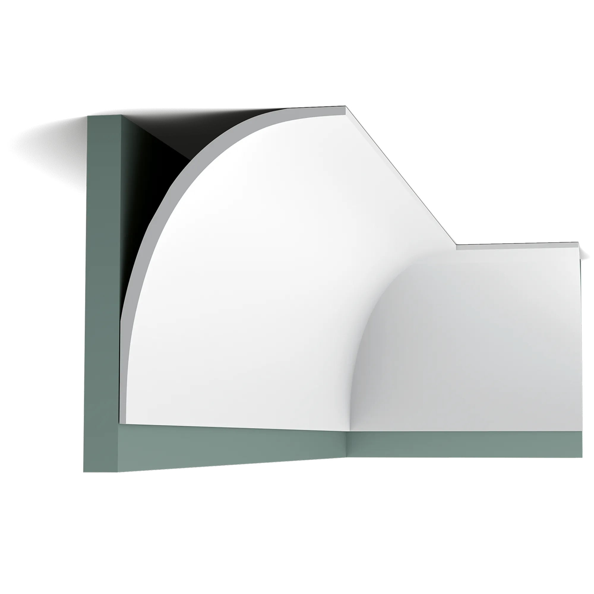 Этот большой, асимметричный и C-образный карниз выполнен в стилистике старых загородных домов Франции. Здесь мы разместили самую длинную сторону карниза на потолке, чтобы визуально расширить помещение.