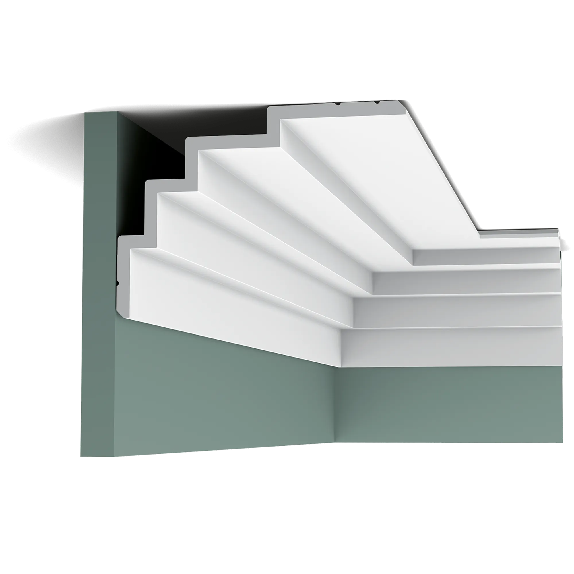 Строгий и современный профиль, ставший основой для серии Steps. Здесь мы разместили самую длинную сторону карниза на потолке, чтобы визуально расширить помещение. Модель имеет срезанный угол сверху и снизу, благодаря чему создается тонкая линия тени.