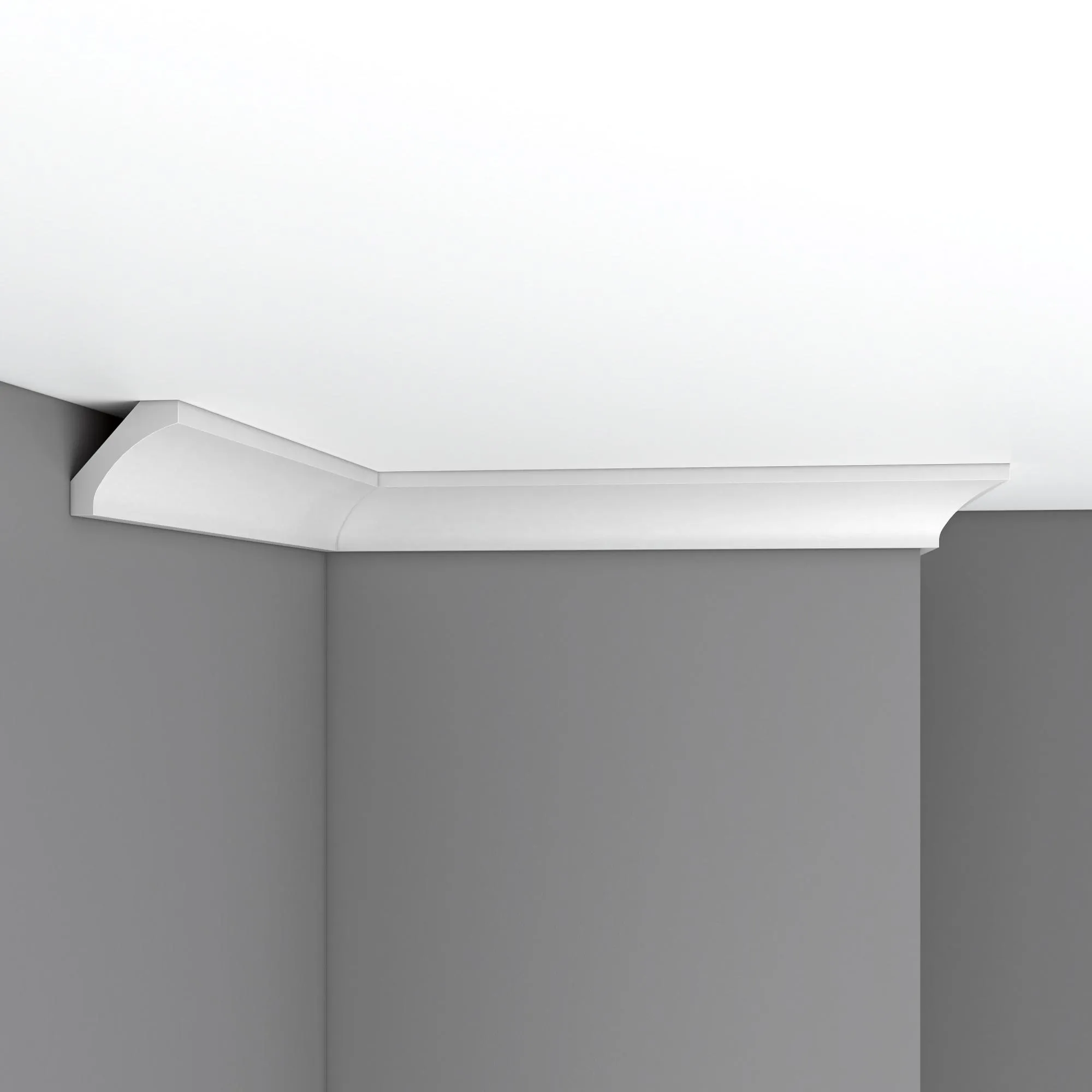 Потолочный карниз из полиуретана 96010 Decomaster. Карнизы используются для придания потолку завершенного вида, для скрытия швов между стеной и потолком добавляя изысканности и стиля в интерьер помещения. Полиуретановые карнизы устойчивы к воздействию влаги, в отличие от некоторых других материалов, что делает их подходящими для использования в ванных комнатах или кухнях.