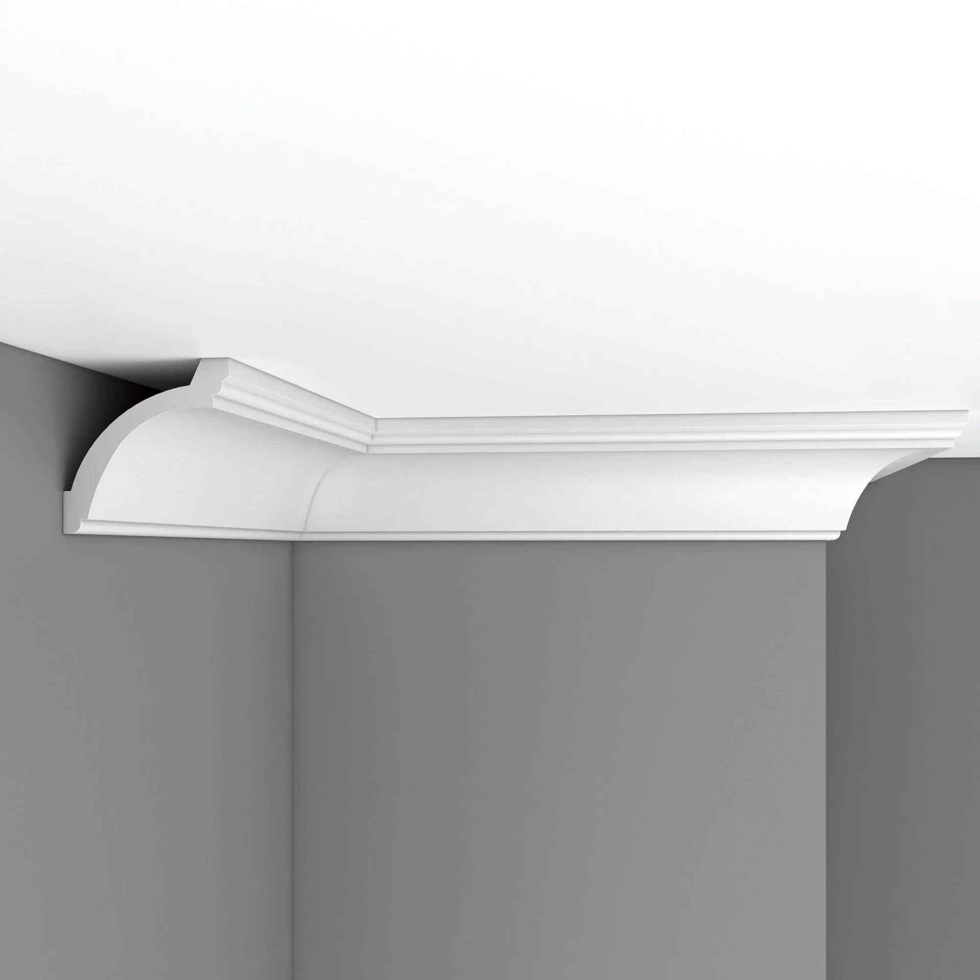 Потолочный карниз из полиуретана 96020 Decomaster. Карнизы используются для придания потолку завершенного вида, для скрытия швов между стеной и потолком добавляя изысканности и стиля в интерьер помещения. Полиуретановые карнизы устойчивы к воздействию влаги, в отличие от некоторых других материалов, что делает их подходящими для использования в ванных комнатах или кухнях.