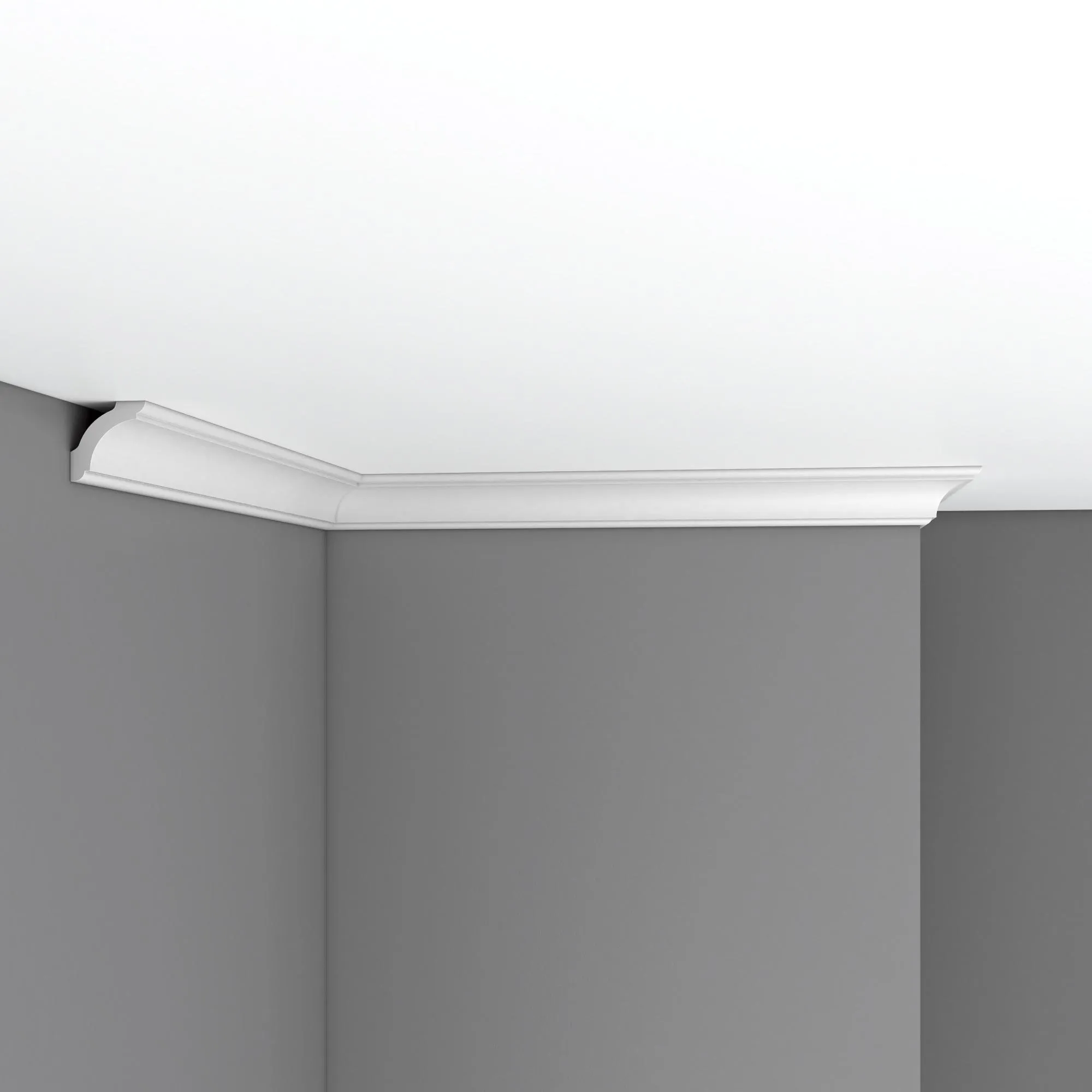 Потолочный карниз из полиуретана 96250 Decomaster. Карнизы используются для придания потолку завершенного вида, для скрытия швов между стеной и потолком добавляя изысканности и стиля в интерьер помещения. Полиуретановые карнизы устойчивы к воздействию влаги, в отличие от некоторых других материалов, что делает их подходящими для использования в ванных комнатах или кухнях.