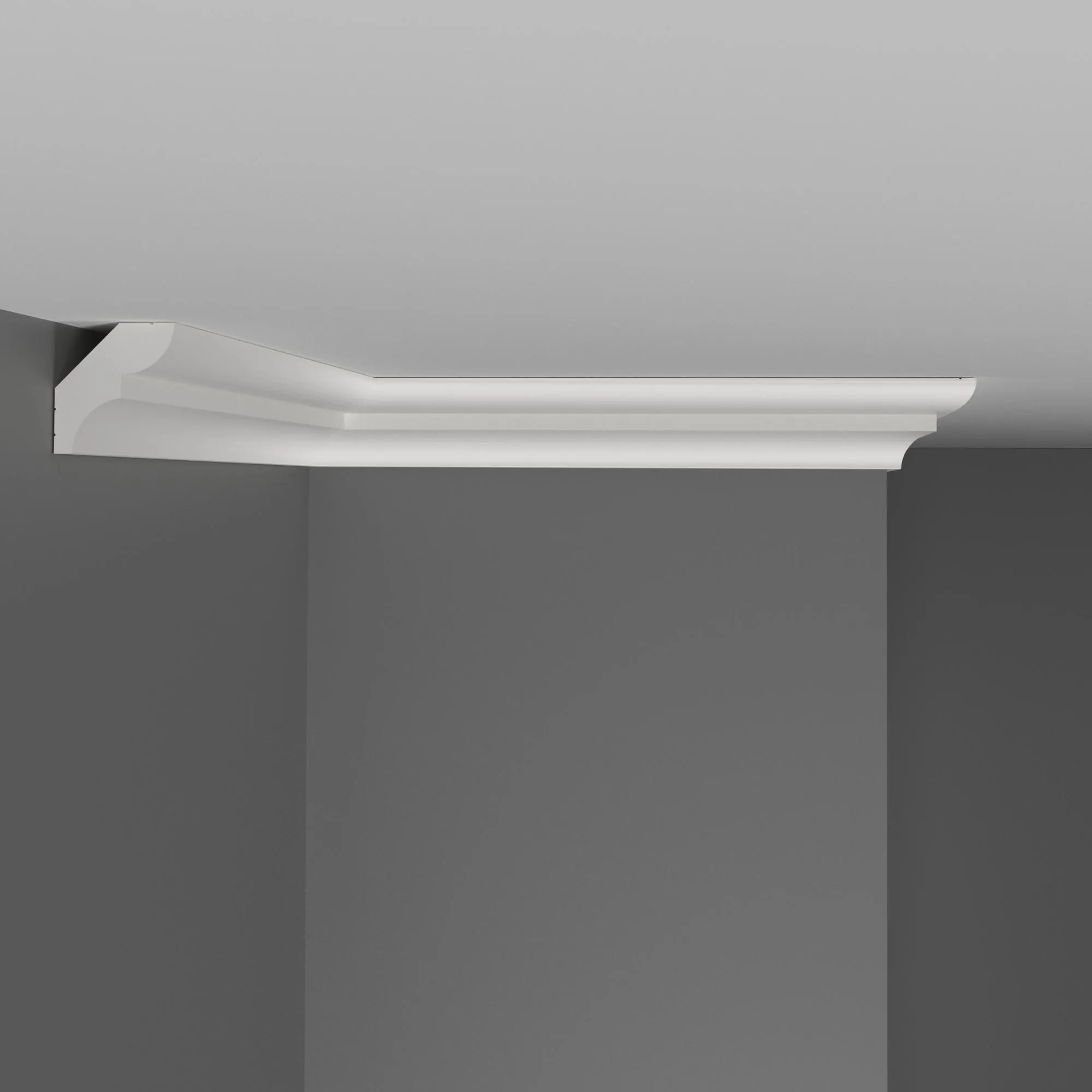Потолочный карниз D008 Decomaster из дюрополимера он же (экополимер, композит, фитополимер) ударопрочной, легкий в монтаже, готов к покраске лакокрасочными материалами не содержащие растворитель. Дюрополимер не содержит токсичных продуктов и со временем не дает усадку. Рекомендуется использовать стыковочный клей для соединительных стыков.