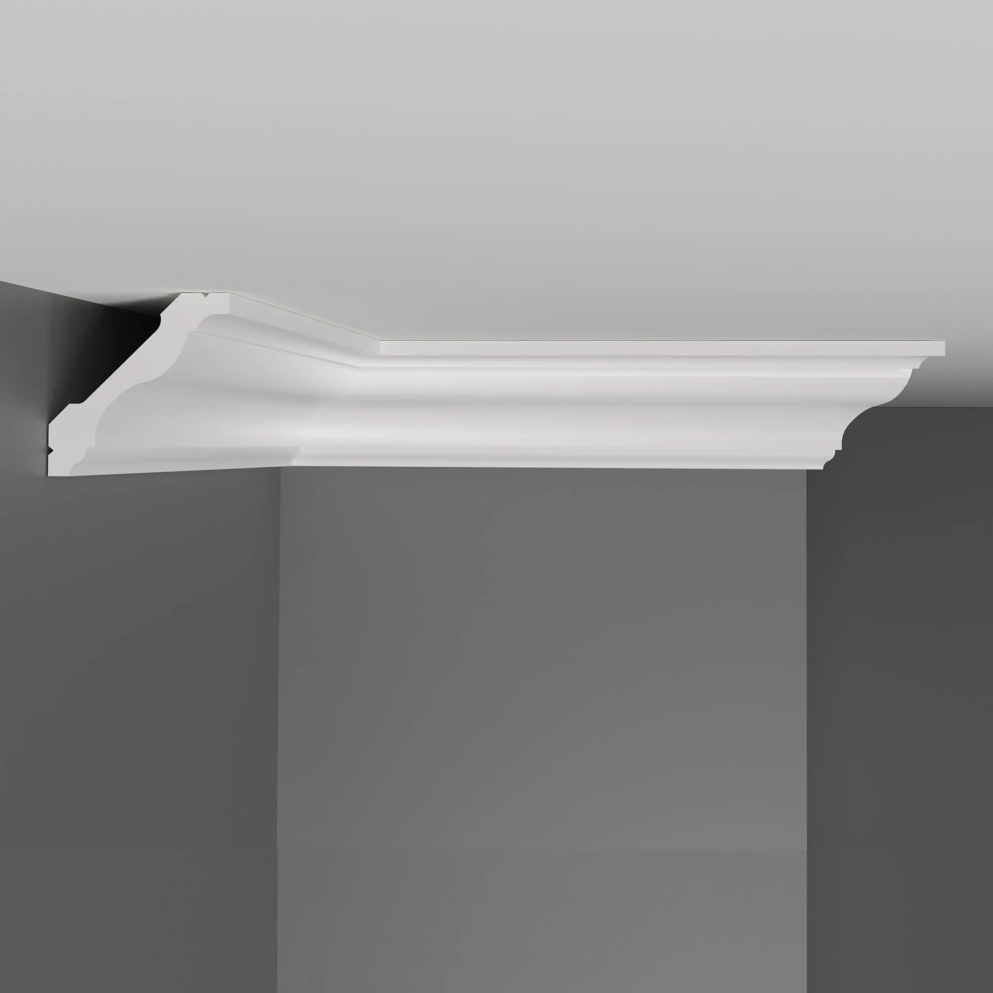 Потолочный карниз D110 Decomaster из дюрополимера он же (экополимер, композит, фитополимер) ударопрочной, легкий в монтаже, готов к покраске лакокрасочными материалами не содержащие растворитель. Дюрополимер не содержит токсичных продуктов и со временем не дает усадку. Рекомендуется использовать стыковочный клей для соединительных стыков.