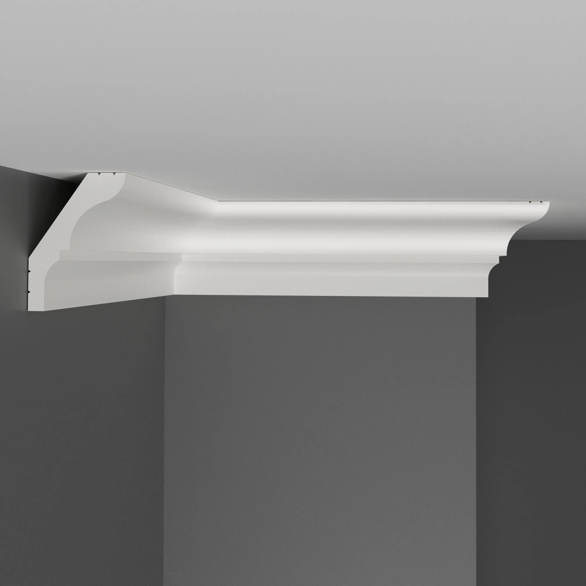 Потолочный карниз D112 Decomaster из дюрополимера он же (экополимер, композит, фитополимер) ударопрочной, легкий в монтаже, готов к покраске лакокрасочными материалами не содержащие растворитель. Дюрополимер не содержит токсичных продуктов и со временем не дает усадку. Рекомендуется использовать стыковочный клей для соединительных стыков.