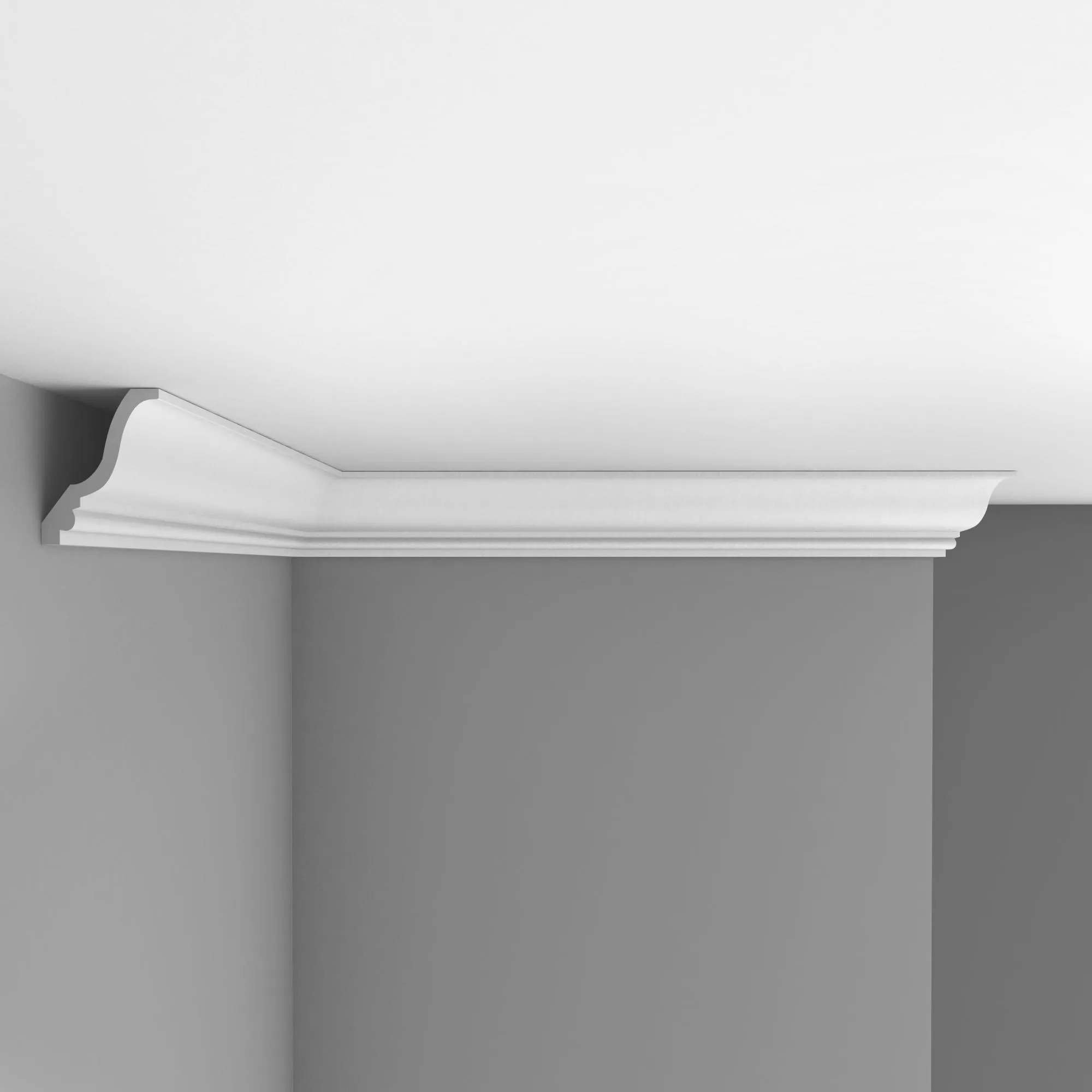 Потолочный карниз из полиуретана 96211 Decomaster. Карнизы используются для придания потолку завершенного вида, для скрытия швов между стеной и потолком добавляя изысканности и стиля в интерьер помещения. Полиуретановые карнизы устойчивы к воздействию влаги, в отличие от некоторых других материалов, что делает их подходящими для использования в ванных комнатах или кухнях.