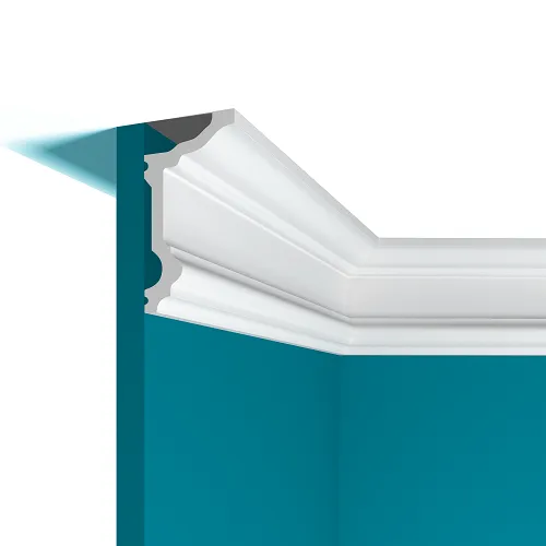 Потолочный карниз Р90 из коллекции перфект plus. Материал дюрополимер он же ( экополимер, композит, фитополимер). Дюрополимер обладает высокой твердостью, прочности не поглощает влагу, что позволяет использование в ванных комнатах и саун. Перед покрытием лакокрасочными материалами не содержащие растворители - рекомендовано про грунтовать. Рекомендуется использовать стыковочный клей для соединительных стыков.