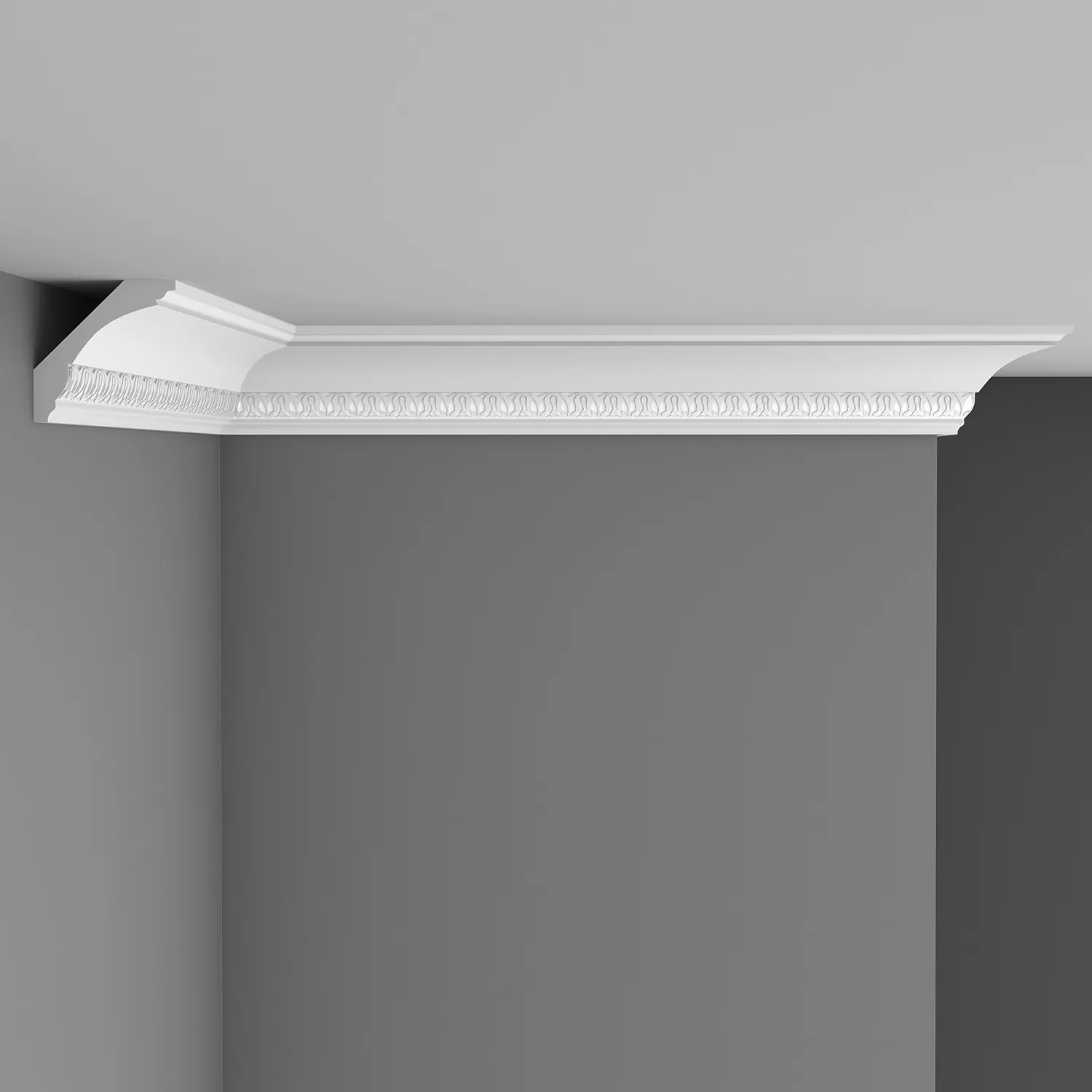 Потолочный карниз D100B Decomaster из дюрополимера он же (экополимер, композит, фитополимер) ударопрочной, легкий в монтаже, готов к покраске лакокрасочными материалами не содержащие растворитель. Дюрополимер не содержит токсичных продуктов и со временем не дает усадку. Рекомендуется использовать стыковочный клей для соединительных стыков.