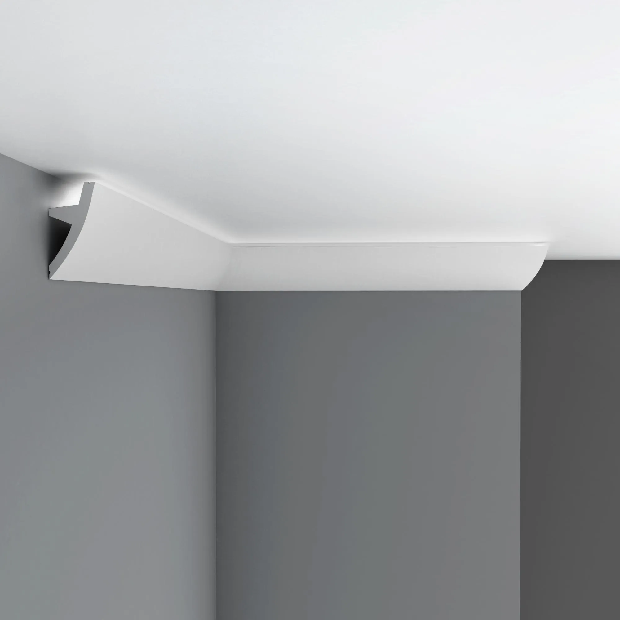 Потолочный карниз для скрытого освещения D502 Decomaster из дюрополимера он же (экополимер, композит, фитополимер) ударопрочной, легкий в монтаже, готов к покраске лакокрасочными материалами не содержащие растворитель. Дюрополимер не содержит токсичных продуктов и со временем не дает усадку. Рекомендуется использовать стыковочный клей для соединительных стыков.