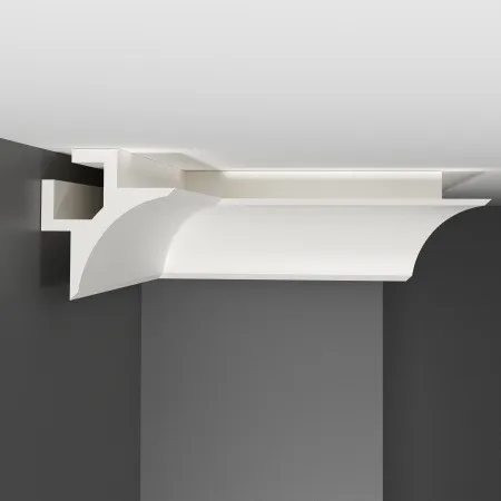 Потолочный карниз для скрытого освещения A201 Decomaster из дюрополимера он же (экополимер, композит, фитополимер) ударопрочной, легкий в монтаже, готов к покраске лакокрасочными материалами не содержащие растворитель. Дюрополимер не содержит токсичных продуктов и со временем не дает усадку. Рекомендуется использовать стыковочный клей для соединительных стыков.