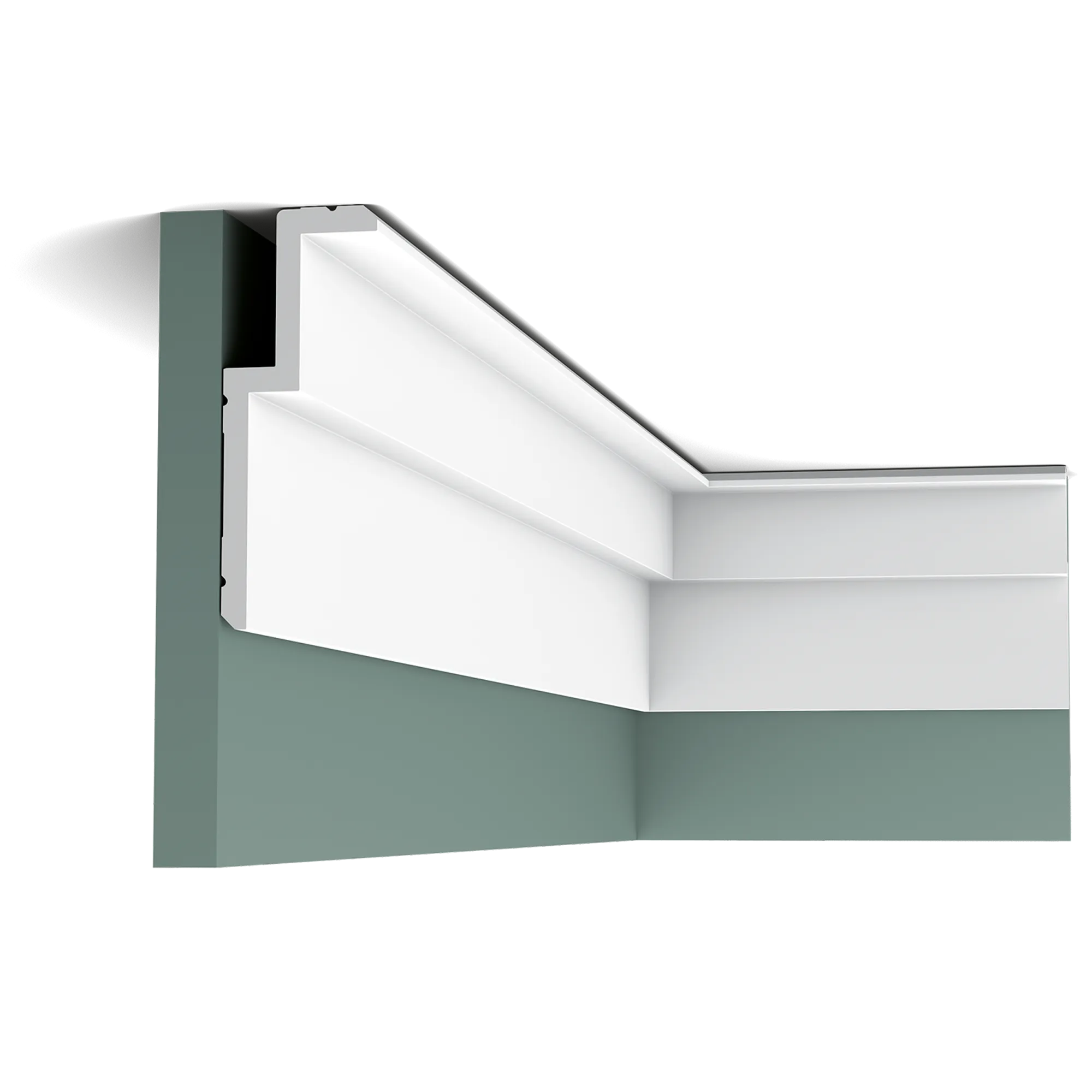 Строгий и современный профиль из серии Steps. Здесь мы разместили самую длинную сторону карниза на потолке, чтобы визуально расширить помещение. Модель имеет срезанный угол сверху и снизу, благодаря чему создается тонкая линия тени.