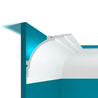 Потолочный карниз Р100 из коллекции перфект plus. Материал дюрополимер он же ( экополимер, композит, фитополимер). Дюрополимер обладает высокой твердостью, прочности не поглощает влагу, что позволяет использование в ванных комнатах и саун. Перед покрытием лакокрасочными материалами не содержащие растворители - рекомендовано про грунтовать. Рекомендуется использовать стыковочный клей для соединительных стыков.