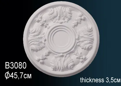 Потолочная розетка B 3080 из полиуретана производителя Перфект будет красивым дополнением к люстре в любом интерьере вашего дома. Материал полиуретана устойчив к воздействию влаги, что делает наши розетки подходящими для использования в различных условиях, включая ванные комнаты и кухни, установка потолочных розеток из полиуретана довольно проста и не требует особых навыков или специальных инструментов, легко покрасить в любой цвет, что позволяет адаптировать их под конкретный дизайн интерьера.