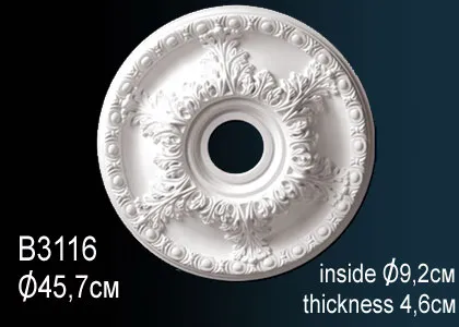 Потолочная розетка B 3116 из полиуретана производителя Перфект будет красивым дополнением к люстре в любом интерьере вашего дома. Материал полиуретана устойчив к воздействию влаги, что делает наши розетки подходящими для использования в различных условиях, включая ванные комнаты и кухни, установка потолочных розеток из полиуретана довольно проста и не требует особых навыков или специальных инструментов, легко покрасить в любой цвет, что позволяет адаптировать их под конкретный дизайн интерьера.