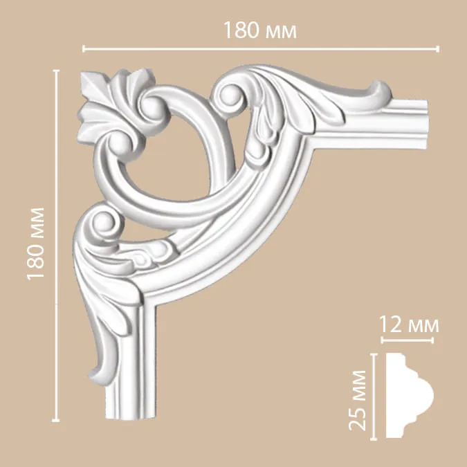 Угловой элемент 97012-6 из полиуретана Decomaster выполненные в форме угла и являющейся составной частью композиции с молдингом 97012 С помощью угловых элементов и молдингов можно создавать различные декоративные рамки как на стенах, так и на потолках. Материал отличается высокой прочностью и долговечностью. Все изделия про грунтованы и готовы под окраску в любой цвет красками, не содержащими растворители. При монтаже рекомендуется использование монтажного и обязательно стыковочного клея во избежания расхождения швов.